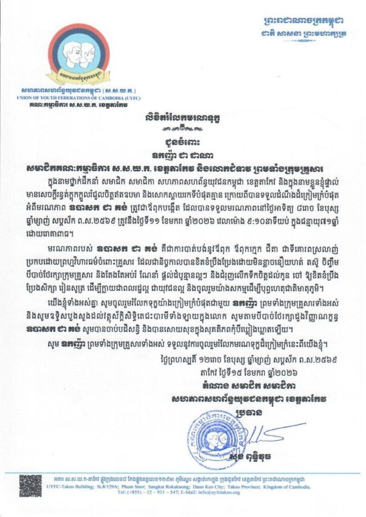 ថ្ងៃទី១៦ ខែមករា ឆ្នាំ២០២៦ ឯកឧត្តម សុខ ពុទ្ធិវុធ សមាជិកគណៈអចិន្រ្តៃយ៍នៃគណៈកម្មាធិការកណ្តាលសហភាពសហព័ន្ធយុវជនកម្ពុជា និងជាប្រធានសហភាពសហព័ន្ធយុវជនកម្ពុជា ខេត្តតាកែវ បានអញ្ជើញចូលរួមរំលែកមរណទុក្ខ ឧកញ៉ា ជា ដាណា សមាជិកគណៈកម្មាធិការ ស.ស.យ.ក. ខេត្តតាកែវ និងលោកជំទាវ ព្រមទាំងក្រុមគ្រួសារ